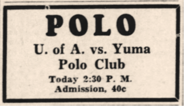The University of Arizona polo team played several games—in Yuma and Tucson—versus the Yuma Valley team and the McDaniel team. The U. of A. program began in 1922 and achieved six Western Intercollegiate championships before being disbanded in 1942 due to the U.S. entry into World War II. It is remarkable that such an acclaimed university program would regularly schedule polo games with teams from Yuma—and even more remarkable that the games were often tightly contested. (In 1934 the university squad escaped with a 6-5 win after trailing for most of the game.)