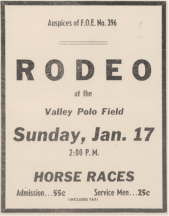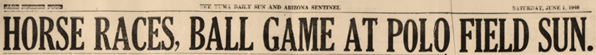 From the outset it was evident that the Yuma Valley Polo Field was going to be a multi-purpose site which would host a variety of community events in addition to polo games. These events included a shooting demonstration, a turkey shoot, midget auto races, FFA livestock shows, Campfire Girls campouts, horse racing, and even baseball. More significantly, from 1930-1943 the polo field was the home for an annual series of rodeos, first sponsored by the Elks and then the Eagles fraternal organizations. Horse shows, often preceded by horse parades, were also held at the polo field. By 1940 polo was absent from the polo field; consequently, promotions for events often mentioned the location as the “old polo field.” For the next few years, horse racing would be the venue’s signature event.