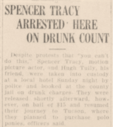 On November 30, 1934 a notable exhibition polo game was held, not at the Yuma polo field, but at Yuma High School’s Doan Field. The Pacific Coast Women’s Polo Association sent two of its teams on a barnstorming tour of the southwest that fall, and thanks to the sponsorship of the Yuma Polo Club, a game featuring the two women’s teams was held in Yuma. The high school football field was much smaller than a regulation polo field, but it was chosen so that more spectators could be accommodated. Polo historian Horace Laffaye later wrote of the Yuma game, “On a hard, fast field, the women played the best game of the tour.” One of the touring polo players was Louise Tracy, wife of famed actor Spencer Tracy. The Tracys had a troubled marriage, but they shared a love of polo and were active members of the Riviera Polo Club. On March 12, 1935, a few months after Louise’s Yuma visit, Spencer Tracy had a far different polo-related experience in Yuma. He was arrested on a “drunk count” at a local hotel where he had stopped off en route to Tucson where he would purchase polo ponies.