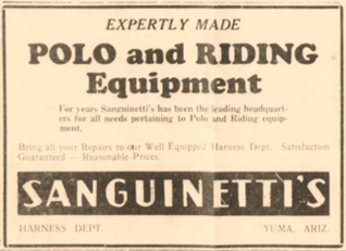 In March 1929 the local newspaper reported that the “polo grounds” had been completed and that a game had been scheduled between the Yuma and Somerton teams. The polo field would undergo several improvements over the next few years, including the construction of stables, grandstand, clubhouse, and loudspeaker system, plus a racetrack which surrounded the regulation-size (300 x 160 yard) field.