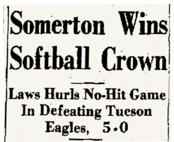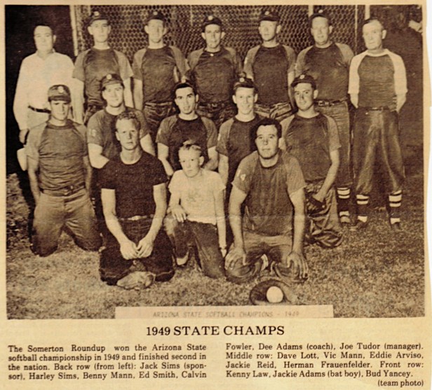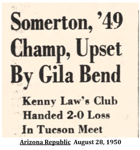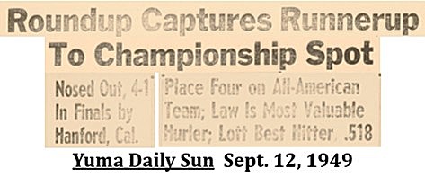The 1949 Arizona state softball tournament presented less of a challenge to the Somerton Roundup than they had faced in the Yuma softball league–an indication of the high level of softball excellence in Yuma. Somerton defeated Avondale 8-0 in game one, a one-hitter by Kenny Law. Game two was a 5-1 victory over Flagstaff, another Law one-hitter. In game three Law gave up 3 hits in a 3-0 win over Ajo, and in the final game Kenny Law threw a no-hitter in a 5-0 win against Tucson. Other Roundup players had excellent performances as well. In addition to Law, Roundup selections to the all-tournament team included catcher Bud Yancey, second baseman Jerry “Red” Cahoon, and outfielders Davy Lott and Bill “Pigeon” Doten. Doten and Cahoon had been added to the Roundup roster from the Bureau of Reclamation team following the conclusion of the Yuma tournament. The state championship was not completely joyful for the Roundup ballplayers: Eddie Arviso’s home in Somerton was burglarized while the team was in Phoenix.