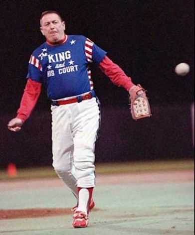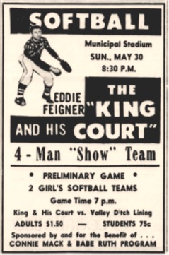 Eddie Feigner pitched in the 1947 National Softball Congress tournament for the 8th place Seattle team. Following this early success as a “legitimate” fast-pitch star, Feigner embarked on a 50-plus year barnstorming career as Eddie “The King” Feigner and His Court. His 4-man team combined softball skills with entertainment and showmanship (pitching blindfolded, etc.) as they challenged local teams around the world to exhibition games, including stops in Yuma in 1964, 1965, and 1970. Eddie Feigner estimated that over his career he traveled 4 million miles and pitched in 14,000 games, including 930 no-hitters and 238 perfect games. Nearly 10,000 of Feigner’s games were victories. Amazingly, the “King” gave up only 3 home runs during his entire reign.
