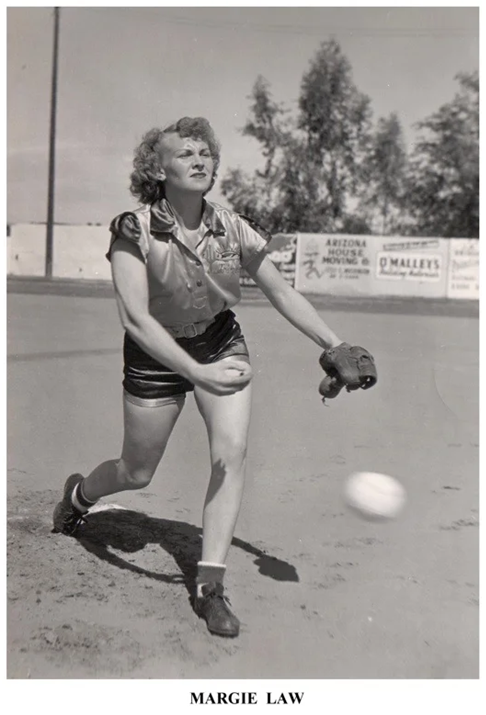 While husband Kenny was commuting from Phoenix to Yuma and Somerton in 1948-1950 to pitch for the Sanguinetti and Somerton Roundup teams, Margie Law was building her own legendary career in Phoenix with the PBSW Ramblers women’s fast-pitch softball team. The Ramblers, who were led by celebrated catcher-manager, Dottie Wilkinson, won national championships in 1940, 1948 and 1949. Margie Wood (Law) was only 16 years old when she starred for the 1940 squad. The Laws were married in 1942 and had three sons. Margie retired from softball in 1958, and after earning her masters degree in Physical Education, she joined the faculty of Arizona State University. She died at age 76 in 2000. Her obituary stated that during her softball career she had been named an All-American 17 times at 3 different positions, primarily as—what else?—a pitcher.