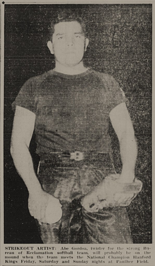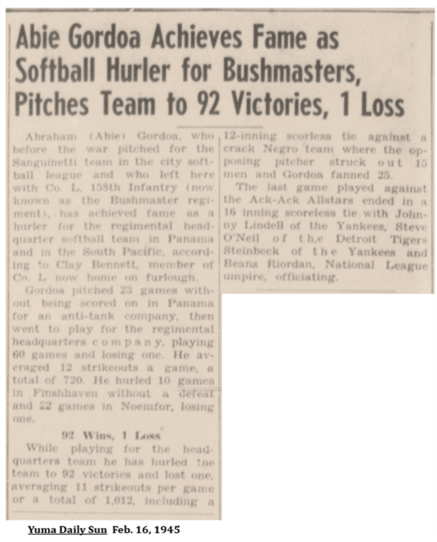 Abraham (“Abie”) Gordoa was not an “import” from Phoenix or elsewhere like the other elite softball pitchers mentioned here. He lived in Yuma for most of his 93 years, working for the Bureau of Reclamation while starring for their softball team. In 1947, when Gordoa was pitching for the Sanguinetti team which won that year’s Yuma’s softball tournament, the local newspaper described him as “the loop’s top twirler.” In 1948 Gordoa became a member of the Bureau of Reclamation team and was once again the winning pitcher of the Yuma tournament’s championship game. During World War II Abraham Gordoa had been a member of the acclaimed Arizona Bushmasters, and as the above article illustrates, he had spectacular success as the pitcher of the Bushmaster softball team. Abie’s 2013 obituary noted that he retired as Fire Captain for MCAS.