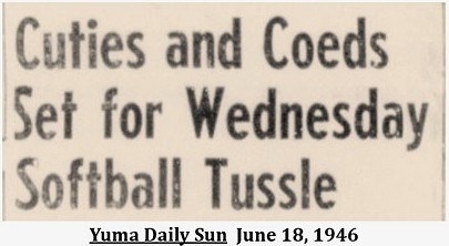 In the late 1940s the Yuma Softball League had 8 teams which played from June to August at Yuma High School’s Doan Field. The participating teams, changed slightly from year to year, but included the following: American Legion, Bureau of Reclamation, Emporium, George Y. Wah, Jack and Kelly, Lutes, Sanguinetti, Somerton Roundup Bar, Yuma Distributing Co., Yuma Merchants, and Yuma Test Branch. There were mid-week and weekend games. At season’s end the top 4 teams played a Yuma tournament with the winning team advancing to the state championship tournament in Phoenix.