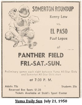 The 1950 Somerton Roundup team included most of the players from the previous year’s national runner-up roster, including ace pitcher Kenny Law, but the Yuma softball league did not stage a local tournament that year. Instead, Roundup and the Bureau of Reclamation scheduled games against each other and with area teams such as El Centro. The Roundup team also played a series of matchups pairing their star pitcher Kenny Law against the El Paso, Texas team with Paul Lopez. In July El Paso traveled to Yuma to play Roundup at Panther Field, and in August the Somerton team traveled to El Paso for a rematch. The Roundup squad was invited to the 1950 state tournament in Tucson, but Gila Bend’s surprising upset victory over Somerton signaled the decline of fastpitch softball in Yuma County.