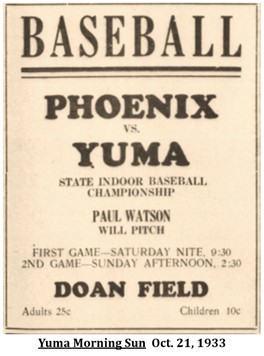 Paul Watson was the first out-of-town softball star “imported” by a Yuma team. In the early 1930s when softball was still referred to as “indoor baseball,” Yuma had an indoor baseball commission which oversaw schedules, ticket sales, and other administrative functions. The commission’s annual report indicated that in 1932 $602 had been spent on “outside players” (namely, Paul Watson). Umpires came much cheaper: $27 total.