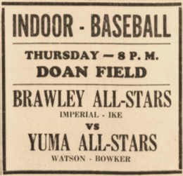 Until around 1935 softball was typically referred to as “indoor baseball.” Yuma had its first indoor baseball league in the summer of 1931, and 20-year-old Paul “Windmill” Watson was the first out-of-town star to be “imported” (i.e. paid) to play softball in Yuma. The legend of Paul Watson had its birth in Whittier, California where he pitched for the American Legion team. In Yuma Watson’s “windmill” delivery gained further notoriety, and by 1934 he was pitching for Phoenix’s celebrated Funk Jewels squad. The Yuma newspaper determined that a two-game series between Yuma and a team of Phoenix All-Stars in October 1933 would decide the “State Indoor Baseball Championship.” Yuma won both games, marking the end of Paul Watson’s memorable contribution to local softball lore.