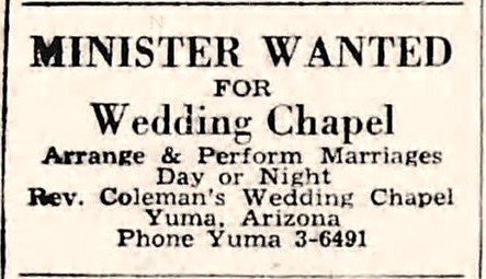 In a 1990 Valentine’s Day profile in the Yuma Daily Sun, Rev. Coleman described the intense competition and “hustling” for couples that went on among Yuma’s various wedding chapels, particularly as couples arrived at the downtown bus and train stations: “ ‘A man could make a good living doing that. I paid as much as $7 for a couple. They were everywhere trying to hustle couples. It was quite an unusual deal in a way, but it was a business,’ said a chuckling Coleman.” Free transportation was offered by most chapels in order to prevent rival “hustlers” from diverting customers to another chapel.