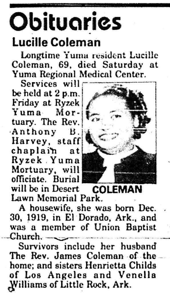 James and Lucille Coleman were both born in 1919–James in Louisiana and Lucille in Arkansas. The Colemans moved to Yuma around 1937, and, with the exception of a brief residence in Los Angeles and James’ two years of Army service at the end of World War II, they resided in the Yuma area for the rest of their lives. Although James did not possess a higher education degree, he was ordained as a Baptist minister as a young man. He had been unable to achieve his goal of becoming an Army chaplain, but he served several years as a chaplain for the American Legion during his 50-year membership in the organization. Rev. Coleman was never head pastor of a congregation, but he assisted at local churches, including Yuma’s Second Baptist Church.