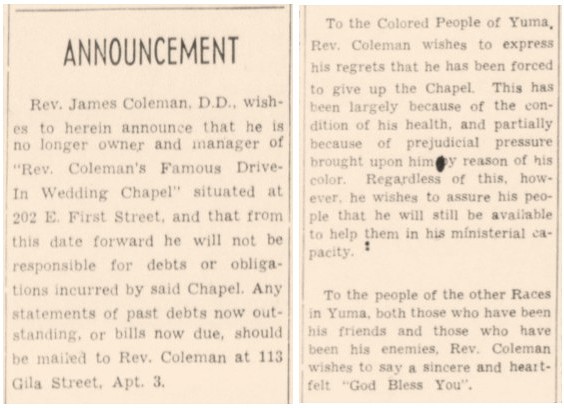 Lucille Coleman died February 25, 1989 at the age of 69. Rev. James Coleman died August 18, 2004 at the age of 84. While best remembered for the Drive-In Wedding Chapel, the Colemans spent nearly all of their adult lives in Yuma, making positive contributions to the community’s religious life, youth welfare, political and social causes, and much more.