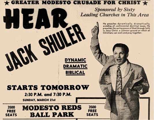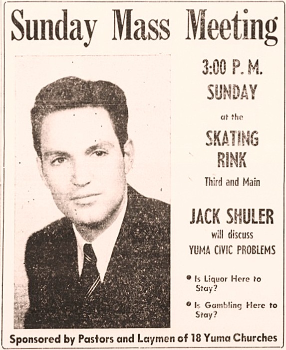 After graduating from Whittier College, Jack Shuler went on to become a renowned evangelist in his own right, traveling extensively across the United States, as well as Canada and Europe. Following his short-lived Yuma marriage, Rev. Shuler married and divorced twice more. He died at age 44 on December 9, 1962.