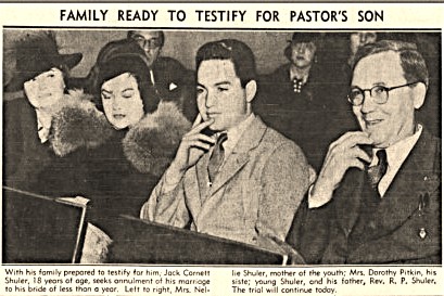 “Fighting” Bob objected when his 17-year-old son Jack eloped to Yuma in May 1936 with his high school sweetheart, Nadine Prather. Jack’s newlywed wife, who was not accepted by her in-laws, quickly filed for divorce, which led the Shulers to successfully countersue for an annulment on the grounds that Jack had been under the minimum age (21) for males to marry in Arizona without parental consent.