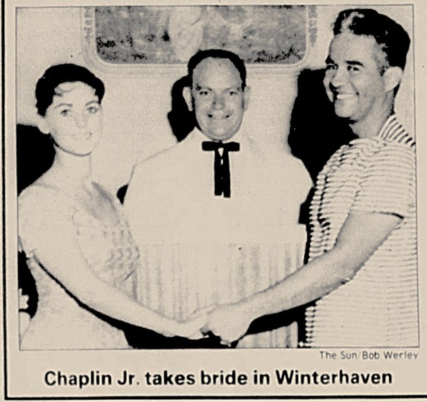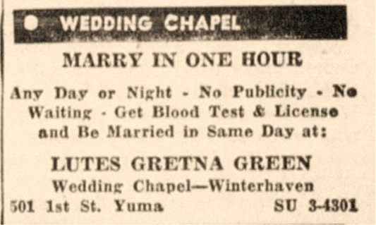 None of Charlie Chaplin’s four marriages occurred in Yuma–despite repeated reports to the contrary. Rather, it was his son, Charlie Chaplin, Jr., who in August 1958 was married at the Lutes Wedding Chapel in Winterhaven, California. Chaplin and his 22-year-old bride arrived in Yuma expecting a “quickie” marriage, unaware that Arizona’s marriage law had changed more than a year earlier by adding a blood test requirement and a 48-hour waiting period. The enterprising Lutes family had adapted to the new marriage law by opening a second wedding chapel across the state line in Winterhaven, Califorina. Charles Chaplin, Jr. and Susan Magnes were given a blood test in Yuma and then transported to the Winterhaven city clerk’s office to obtain a California marriage license, and then delivered to the Winterhaven chapel–where they obtained their quickie marriage after all! Sadly, Charlie Chaplin, Jr. struggled to find work in motion pictures, and his Yuma marriage ended in divorce, as did a second marriage. When he died at age 42 from a massive blood clot, the wire service report concluded that “the actor never escaped from the shadow of his father.” The burden of fame is often mentioned in biographies and profiles of celebrities, but the burden of “relative” fame experienced by Charlie Chaplin, Jr. and so many others can be an even heavier one.