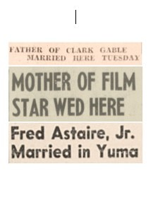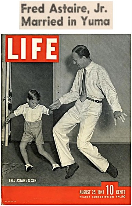 Fred Astaire, Jr., 20, and Gale Trumbo, 18, eloped to Yuma for a September 1, 1956 marriage at the Lutes wedding chapel, two months before Arizona voters approved a new marriage law. Being under 21, the groom required parental consent which was given in the form of a note from the father, legendary dancer Fred Astaire. The groom was an airman in the U.S. Air Force. The bride was a singer, and it was her desire for a singing career that led Fred, Jr. to file for divorce in 1963. He enjoyed a long second marriage with wife Carol, a painter and photographer who operated a studio in San Luis Obispo, California. Fred worked as a rancher, pilot, dance instructor and choreographer. The Astaires were longtime patrons of the arts in their community.