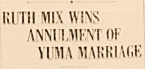 Ruth Mix, 17, and Douglas Gilmore, 27, were married by Earl Freeman at the Yuma courthouse on June 9, 1930. Ruth lied on her wedding license application that she was 18 years old. Although Ruth’s parents were unsuccessful in having Yuma law enforcement officials stop the couple’s wedding, the brief (3-week) marriage was later annulled. Ruth’s father, Tom Mix, the famous movie cowboy, supposedly responded, “I should have taken my horse and gone after them myself.”