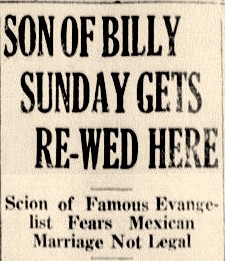 Billy Sunday, Sr. was a top professional baseball player in the 1880s who walked away from baseball to become one of America’s most popular barnstorming Christian evangelists of the early 20th century. Billy Sunday, Jr., 27, and Julia Mae Sunday, 27, were remarried in Yuma by Justice of the Peace Earl Freeman on April 30, 1928. (Freeman was not yet known as Yuma’s “marrying judge,” since California’s restrictive “gin marriage” law had only recently gone into effect.) The legality of the couple’s earlier Tijuana marriage had been questioned by their attorney. Unfortunately, the remarriage did not last. Julia Mae, Billy’s second wife, filed for divorce in 1929, and his third wife did likewise in 1931. Billy Sunday, Jr., who worked primarily as a real estate agent, died at age 37 from pneumonia in April 1938.