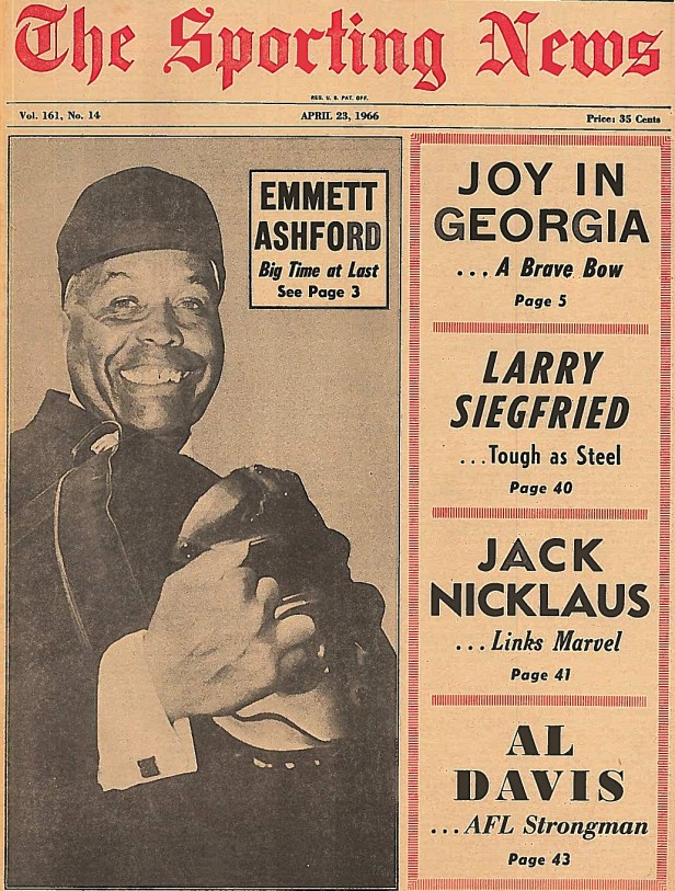 The caption above speaks volumes: “Big Time at Last.” Emmett Ashford was 51 years old when he finally got called up to work as a Major League umpire–the first black man to achieve that distinction. Due to baseball’s mandatory retirement age for umpires, Ashford’s Major League career lasted only five years.