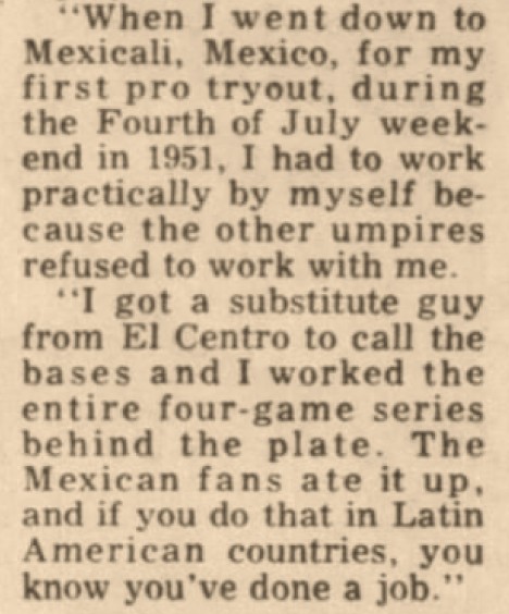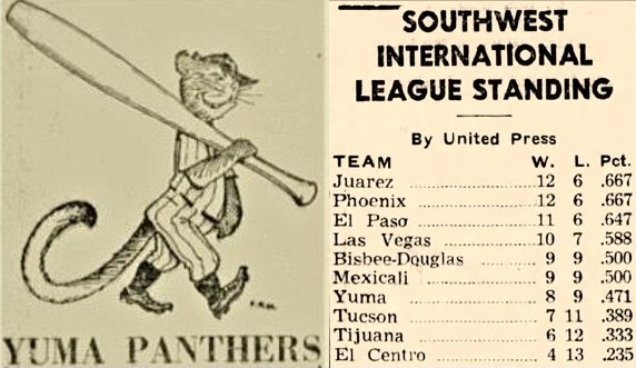 The Yuma Panthers (1950-1952) were Yuma’s first minor league baseball team. The standings listed above were published following the conclusion of the four-game series between Mexicali and Yuma which featured Emmett Ashford breaking a long-standing “color line” by working as the first black umpire in organized baseball (i.e. non-Negro League professional baseball). The league president Les Powers was familiar with Emmett Ashford’s umpiring experience with West Coast college teams, and he offered Ashford a tryout opportunity in Mexicali. The umpire requested a leave of absence from his post office job–which he would leave permanently at the end of the 1951 season. His success and popularity in the Southwest International league convinced Ashford to make umpiring his full-time vocation, but his new career got off to a rocky start in Mexicali as he later recounted: