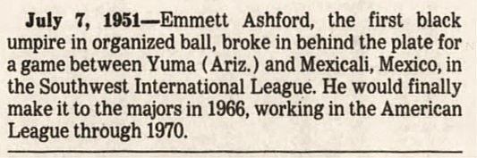 On March 1, 1980 Emmett Ashford died at age 65 from a heart attack. Since retiring as a Major League umpire following the 1970 season Ashford had been working as a special assistant to baseball commissioner Bowie Kuhn who offered a touching eulogy at Ashford’s funeral: “As the first black umpire in the major leagues his magnanimous nature was sternly tested. But he was unshaken and uncomplaining, remaining the colorful, lovely personality he was all his life.”