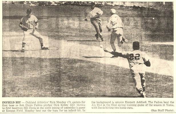 In 1969 the San Diego Padres held their first season of spring training at Yuma’s Keegan Field. Emmett Ashford was an American League umpire but was part of the crew for the above interleague game between the Padres and the Oakland Athletics. He can be seen here running down the foul line to get a better view of a close play at first base. When he worked in the field as a base umpire, Ashford would often break into a sprint to get closer to the action–a strategy resented by some of his more stationary colleagues.
