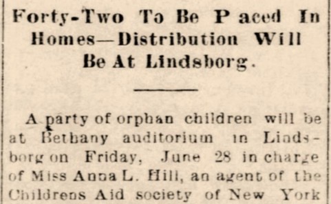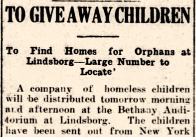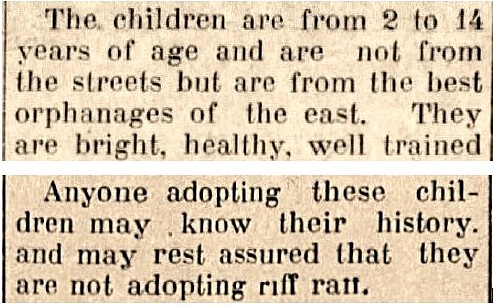 These clippings are from orphan train promotional announcements. In fairness, the Children’s Aid Society also stated, “. . . under no circumstances will a child be placed with people who wish chore boys or kitchen drudges.” But the labor shortage on midwestern farms did lead some families to select those children who appeared most capable of providing manual labor. Since a majority of the children were not legally adopted–most, in fact, had at least one living parent–the system was primarily an early foster care program. A sad result was that many of the participants had unstable childhoods lacking a sense of security, belonging and love.