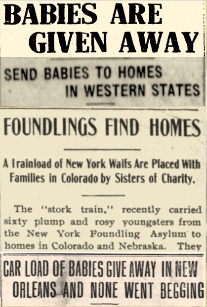 The New York Foundling Hospital employed a different method of placing children than the Children’s Aid Society. Children were essentially pre-ordered and then delivered by train to the requesting families. Since so many infants were abandoned or given up at the Foundling Hospital, it was sometimes necessary to schedule “baby trains” full of youngsters such as those in the photo. As a Catholic organization, the Foundling Hospital strove to place Catholic children with Catholic families. Local priests and nuns took on similar roles to those of the Children’s Aid Society’s screening committees.