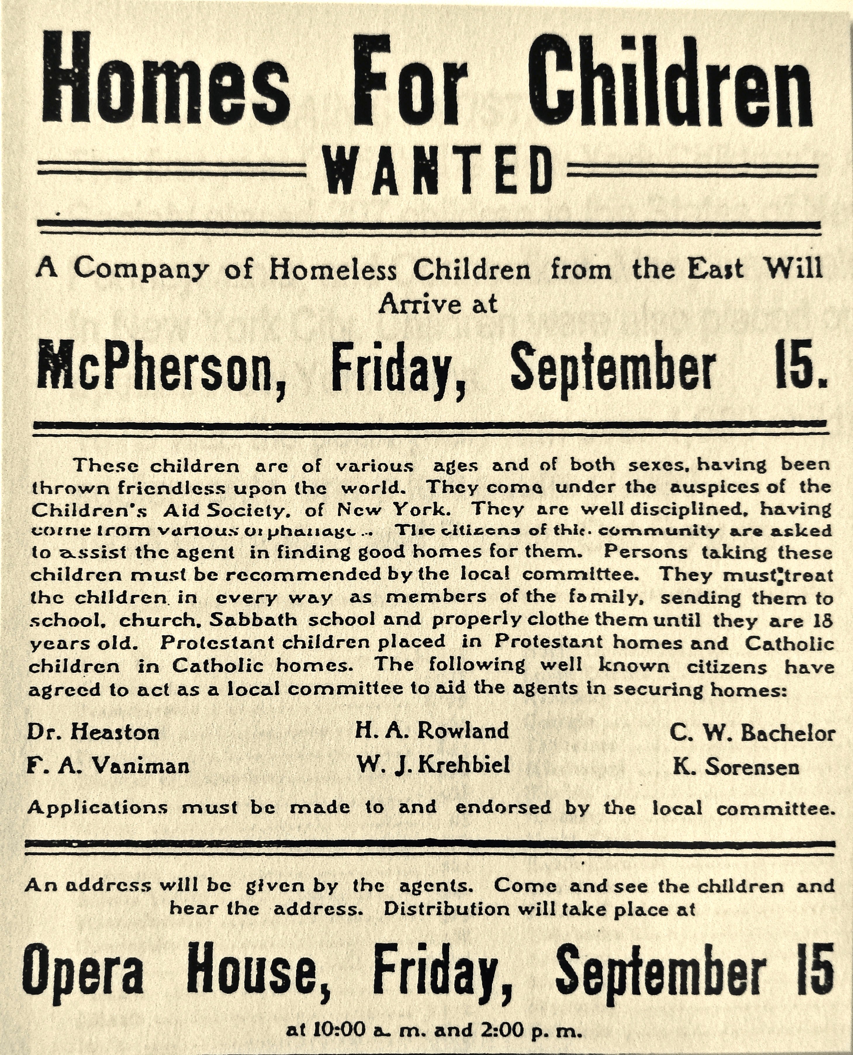 Over time the placing out procedures became well-defined. Small rural communities located on major railroad routes were contacted so that dates and public venues could be arranged. Newspaper ads and posters were provided to alert the local populations of the coming orphan trains. Each community was asked to form a selection committee, while placing agents tried to provide oversight by making follow-up visits once the children were placed in new homes. But in reality, the program was dependent on the good faith of the participating families.