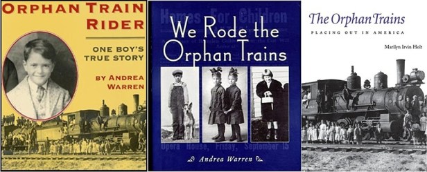 The Andrea Warren titles shown here were written for young readers, but they offer poignant personal accounts that adults will also appreciate. Marilyn Irvin Holt’s book is a more scholarly examination of the orphan trains, and the author also served as a consultant for an informative documentary produced by the Smoky Hills [Kansas] PBS network: