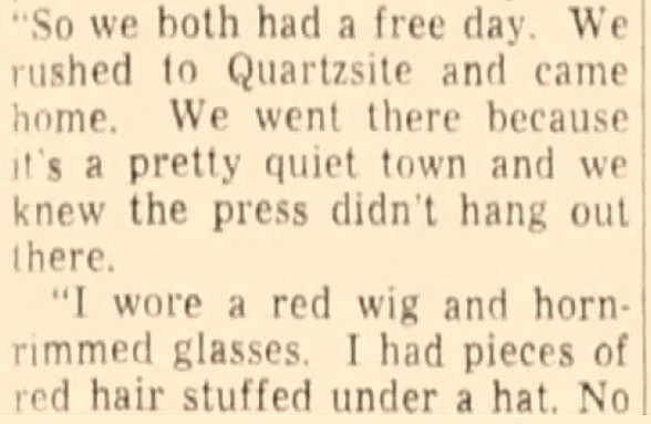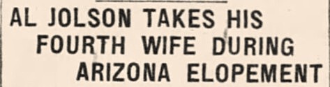 On May 24, 1945 legendary entertainer Al Jolson, age 56, eloped to Quartzsite, Arizona with his 22-year-old bride, Erle Galbraith. Justice of the peace E.B. Hart married the couple who had driven from Jolson’s Palm Springs residence to Quartzsite–a more direct destination than Yuma for their “quickie” marriage.