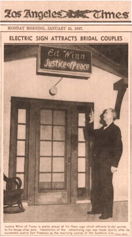 When Ed Winn succeeded Earl Freeman as Yuma’s Justice of the Peace, he installed an electric sign at his residence promoting his after hours marriage services. Imagine Winn’s surprise when he was awakened by comic genius Stan Laurel at 5 a.m. on New Year’s Day 1938. (Laurel eloped to Yuma three times—twice with the same woman.)