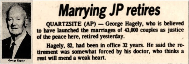 George Hagely succeeded E.B. Hart as Quartzsite justice of the peace in 1946 and held the position until retiring in 1977 at age 82. Hagely estimated that in his 32 years as J.P. he married 43,000 couples. Judge Hagely reportedly had a sign on his home which read, “Let’s Get Married.” (For more about this legendary native son of Quartzsite, visit camelcorps.org.)