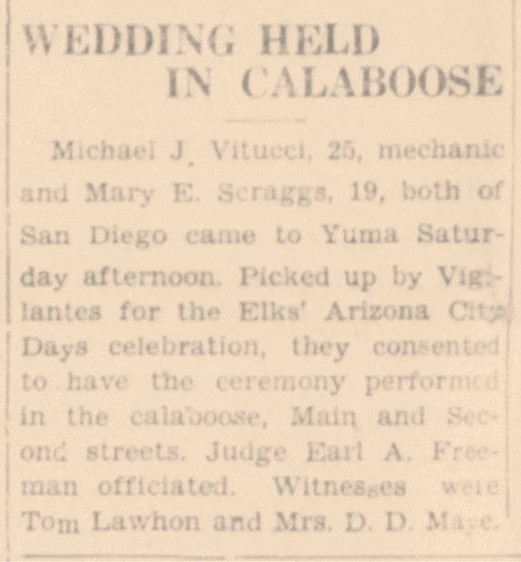On November 14, 1936 a real wedding was held in a pretend jail when a San Diego couple was married during Yuma’s Arizona City Days event. The Elks Vigilantes manned a “calaboose” as part of the celebration, and the young couple agreed to be “arrested and sentenced” to a calaboose wedding conducted by Justice of the Peace Earl Freeman.