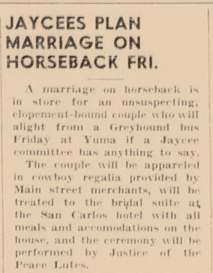 When Bob Eley and Diane Kling eloped from Los Angeles to Yuma on a Greyhound bus for a Valentines Day 1947 wedding, they had no inkling that they would be randomly chosen to be married on horseback during the 2nd annual Silver Spur Rodeo Parade. The young couple happily agreed to the ceremony which was conducted by Yuma’s tall-in-the-saddle Justice of the Peace R.H. Lutes. The newlyweds later revealed that they had always wanted a big wedding—but never expected “anything like this.” A disaster nearly occurred when rice thrown by parade-goers frightened one of the horses.