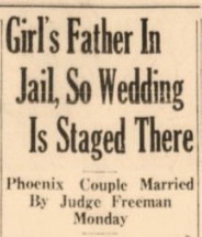A Phoenix couple requested to have Justice of the Peace Earl Freeman marry them at the Yuma County Jail. The bride’s father was being held in Yuma on a prohibition-era bootlegging charge, and since his presence was desired at the wedding, arrangements were made to hold the ceremony in the “consultation room” of the Yuma County Jail.