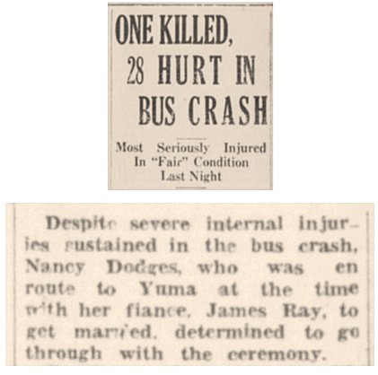 On March 24, 1934 a Greyhound bus en route to Yuma overturned on Highway 81, causing one fatality and several injuries. Nancy Dodges, who had traveled to Yuma with her fiancé James Ray, was one of the most seriously injured passengers. The planned Yuma marriage took place, but with some modifications. Rev. W.S. Brown married the couple in their room at the Hotel del Ming—with the bride’s nurse as one of the witnesses.