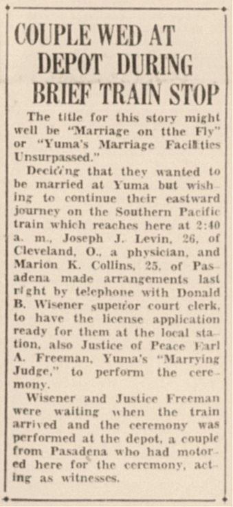 During Yuma’s no-waiting era, marriage officials could be called on anytime and anywhere to perform a ceremony. On Sunday January 7, 1934 Yuma’s Justice of the Peace Earl Freeman married an L.A. couple in their car after they tracked him down at the Yuma Polo Field.
