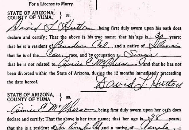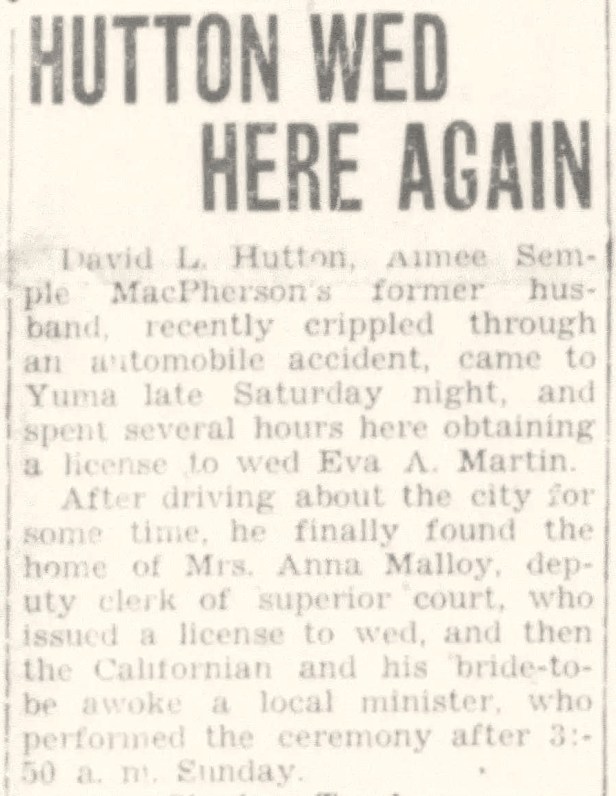 On May 2, 1937 David Hutton again eloped to Yuma–this time by automobile–to marry Eva Martin, a piano teacher from Pasadena. The couple was married by Rev. R.C. Acheson at the Presbyterian parsonage.