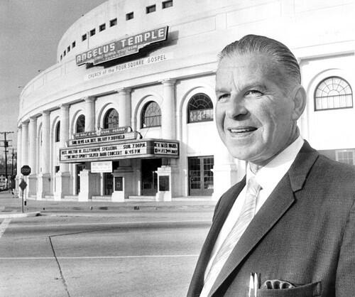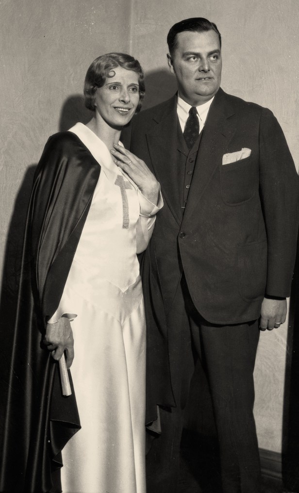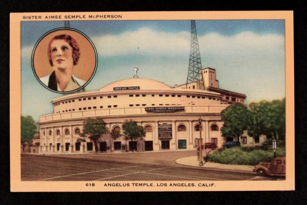 The man pictured with Aimee McPherson is radio operator Kenneth Ormiston. In February 1924 the Angelus Temple launched its own radio station. According to Claire Hoffman, “Aimee was the first woman to hold a radio license in the United States, and KFSG one of the country’s first radio stations for a religious organization.”
