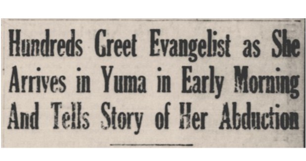 On June 26, 1926 Sister Aimee stopped briefly at the Yuma railroad depot to address a crowd of nearly one thousand locals. As the headline indicates, she related the events of her kidnapping and escape, while also leading the crowd in a hymn. Aimee then resumed her journey back to Los Angeles, accompanied by her children and her mother.