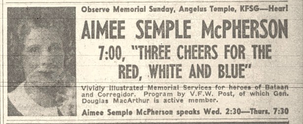As the above sermon title indicates, Sister Aimee was a strong supporter of the U.S. war effort during World War II, and she proudly took part in several war bond rallies.