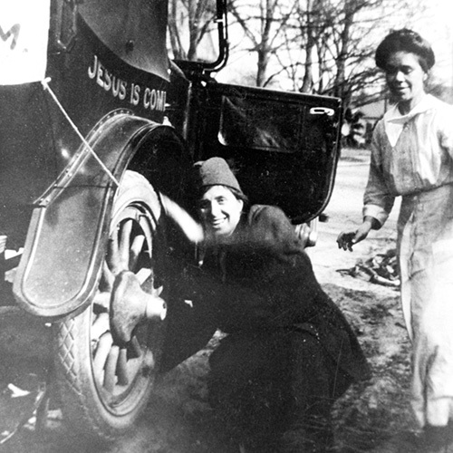 Also a member of the traveling party was stenographer Mabel Bingham, pictured here with Aimee. While driving, Sister Aimee would dictate notes to Bingham for sermons and articles. According to Mabel Bingham, “We faced bad roads; I watched Sister routinely repair flat tires, put on snow chains, nurse along a leaky radiator and complete mechanical repairs to get us to the next town with a garage. When we truly needed the expertise of a mechanic, God led us to just the right person or place.”