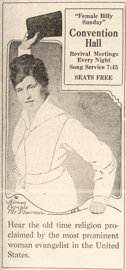 There are many online videos and documentaries concerning Sister Aimee. A good place to start is this brief overview from the Foursquare Church which includes a wealth of striking images, as well as samples of Aimee Semple McPherson speaking from the pulpit.
