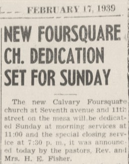 In February 1939 Yuma’s Foursquare congregation began meeting at a newly constructed church building at 1104 Seventh Avenue. The Foursquare church continued at that location for the next 75 years. In later years there were some name changes (Oasis Fellowship, Kings Orchard Foursquare, and Victorious Church International), but these churches remained affiliated with the Foursquare denomination. Yuma no longer has a Foursquare church, but the location is still home to an active Spanish-language church.