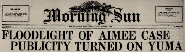 The “kidnapping hoax” theory gained momentum when the friendship between Sister Aimee and Kenneth Ormiston came to light, along with the fact that Ormiston had left his wife a few months earlier. Newspaper reports detailed a rumored “lovers’ tryst” at a Carmel-by-the-Sea “love shack.” Many persons (across the nation) came forward to share their reported sightings of Aimee McPherson and Kenneth Ormiston during the days of her supposed kidnapping. And, as the headline below notes, for a moment, the “floodlight of Aimee case publicity turned on Yuma.”
