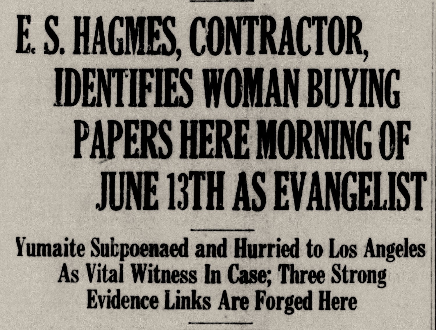 Two Yuma men testified at a preliminary hearing in Los Angeles that they saw Aimee Semple McPherson in Yuma on June 13, 1926—ten days before her reappearance in Agua Prieta. According to gas station attendant Joe Primrose and contractor E.S. Hagmes, Aimee was in an automobile driven by a man matching the description of Kenneth Ormiston. Hagmes claimed that he overheard Aimee asking for copies of out-of-town Sunday newspapers.