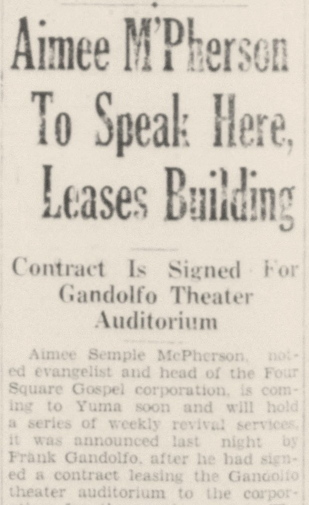 The article on the left refers to a series of Four Square Gospel revival services held at the Gandolfo Theater in June 1929. Aimee Semple McPherson was unable to attend the Yuma revivals which were led by other pastors from Sister Aimee’s Angelus Temple. It took several more years, but on April 20, 1935 the Yuma Foursquare Church began holding regular services in a building of its own—a former Masonic Hall on First Avenue. The notice on the right refers to Yuma’s newest church as “The Church With The Smile.”