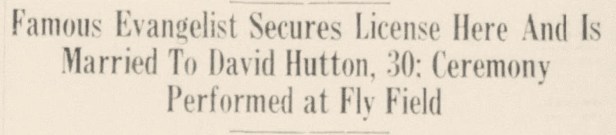Aimee Semple McPherson and David Hutton eloped to Yuma by airplane at 4:00 a.m. on Sunday September 13, 1931. Sister Aimee’s son Rolf and daughter-in-law Lorna were also in the elopement party which briefly lounged at the San Carlos Hotel while waiting for court clerk Donald Wisener to arrive with a marriage license application. The group, which also included Harriet Jordan, dean of the Angelus Bible college, returned to Fly Field where Rev. Jordan married the couple as they stood near their airplane in a light rain. The pilot then rushed the newlyweds back to the Angelus Temple in time for Aimee to lead the Sunday services.