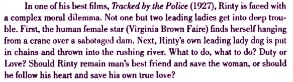 Silent Stars by noted film historian Jeanine Basinger includes an admiring profile of Rin Tin Tin. In the above excerpt, Basinger describes the “love or duty” dilemma faced by Rin Tin Tin in “Tracked by the Police.” The heroic Rinty chose duty, of course, and he was relieved to discover that his “leading lady dog” Nanette survived her ordeal, as well.