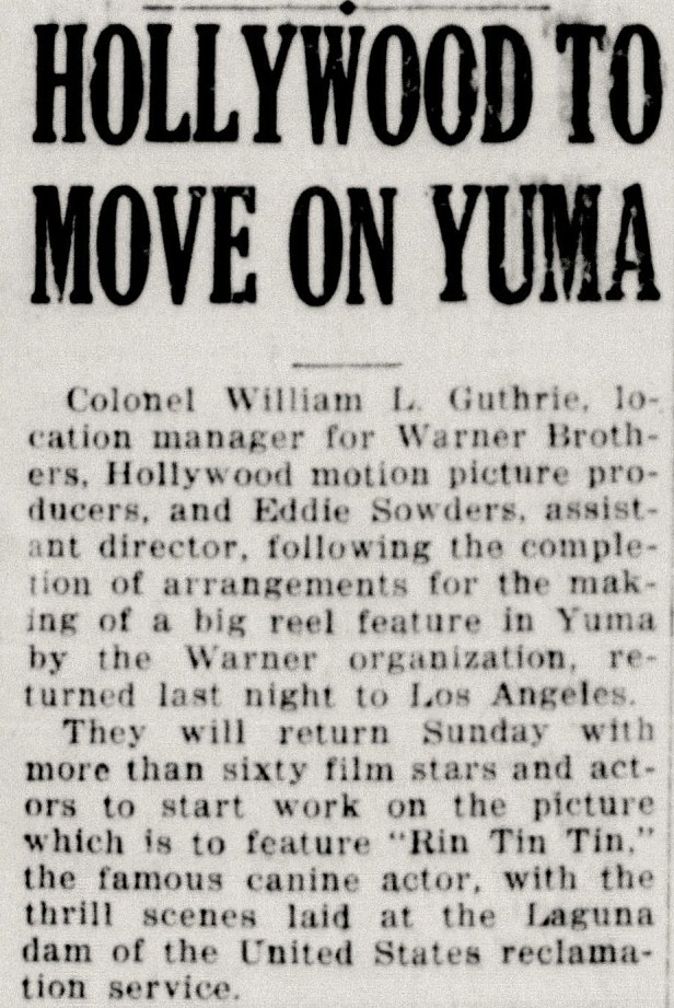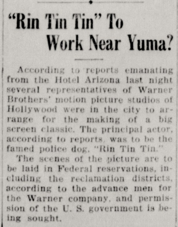 These articles report that Rin Tin Tin and over 60 cast and crew members from the Warner Brothers company were coming to Yuma to make a film at the Laguna Dam. The filmmakers requested permission from the Bureau of Reclamation to spend approximately 3 weeks at the dam.
